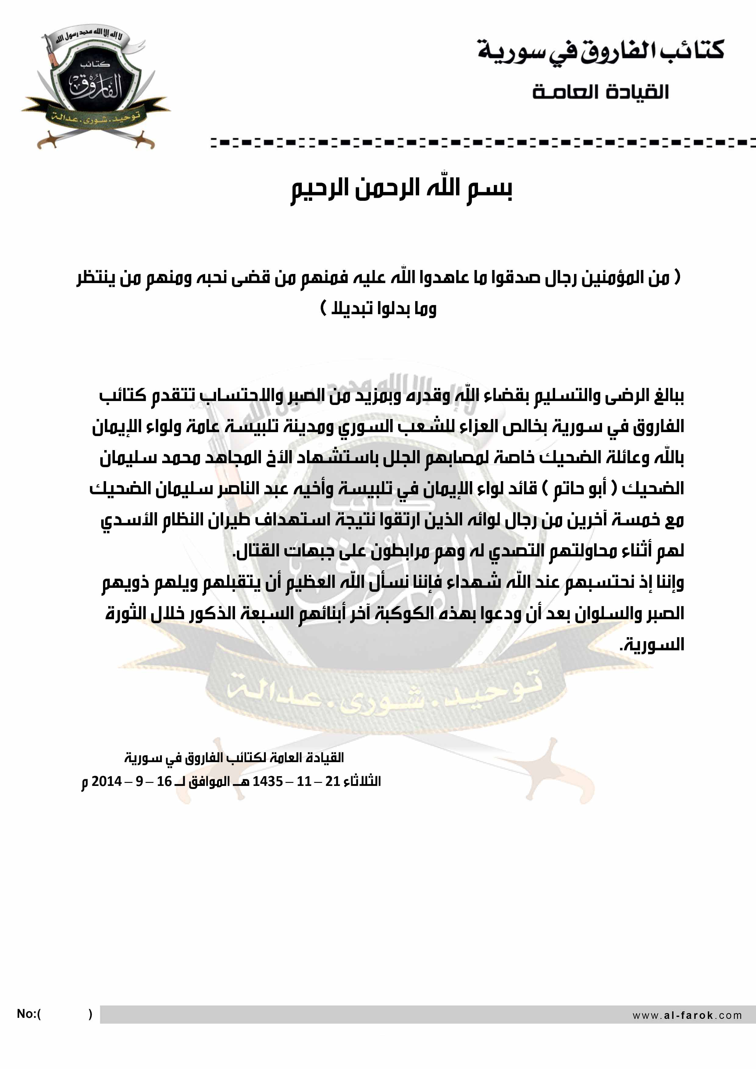 ببالغ الرضى والتسليم بقضاء الله وقدره وبمزيد من الصبر والاحتساب تتقدم كتائب الفاروق في سورية بخالص العزاء للشعب السوري ومدينة تلبيسة عامة ولواء الايمان بالله وعائلة الضحيك خاصة لمصابهم الجلل باستشهاد الأخ المجاهد محمد سليمان الضحيك ( أبو حاتم ) قائد لواء الإيمان بالله في تلبيسة وأخيه عبد الناصر سليمان الضحيك مع خمسة آخرين من رجال لوائه، الذين ارتقوا نتيجة استهداف طيران النظام الأسدي لهم أثناء محاولتهم التصدي له وهم مرابطون على جبهات القتال.