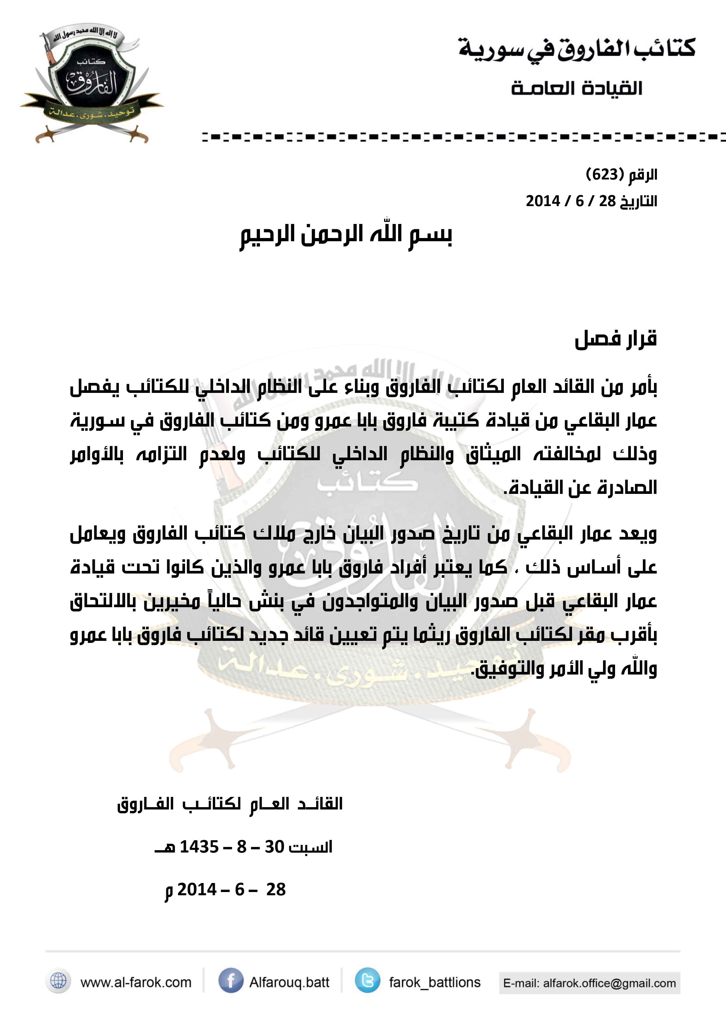 بيان صادر عن القائد العام لكتائب الفاروق يقضي بفصل عمار البقاعي من كتائب الفاروق