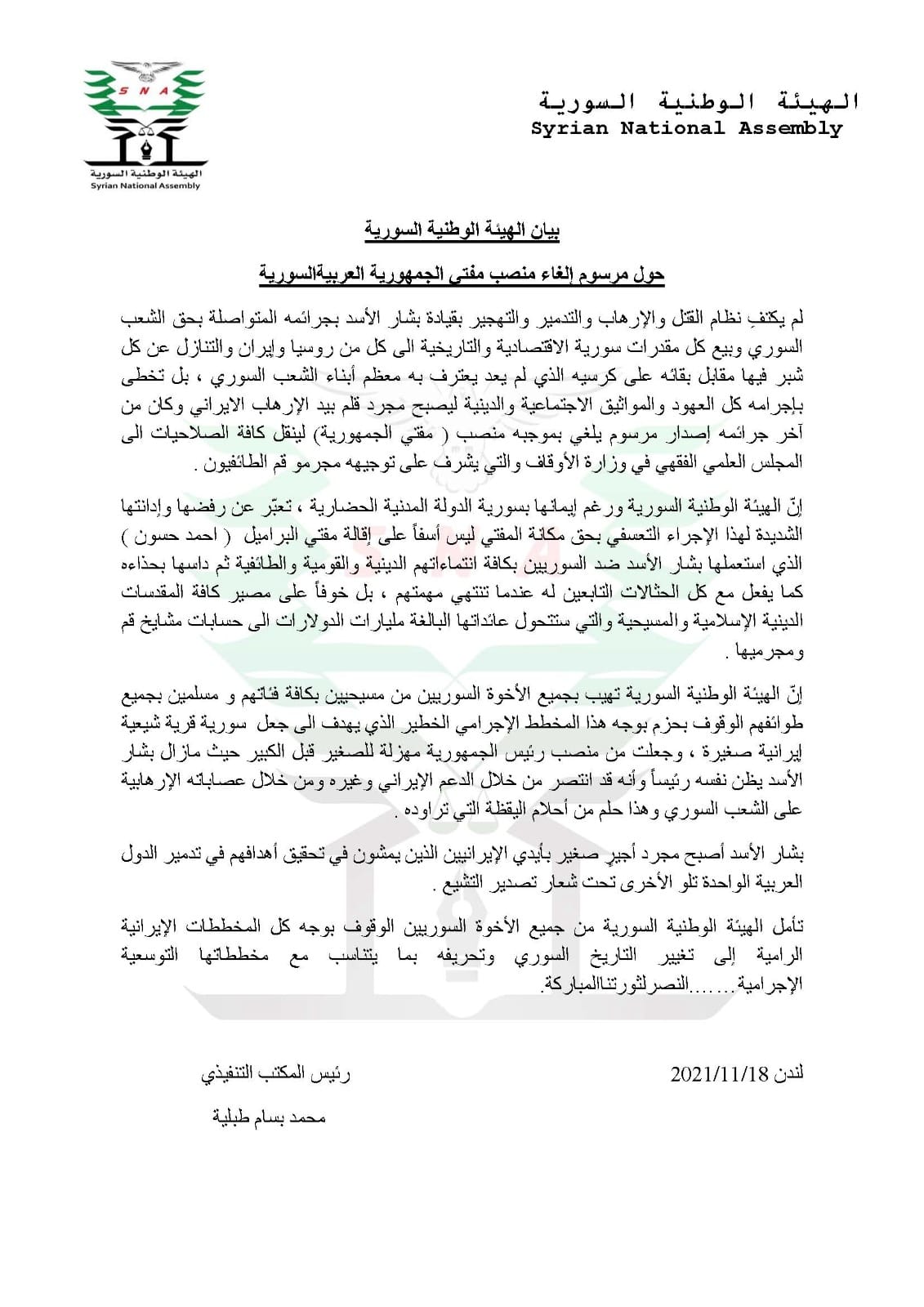 بيان الهيئة الوطنية السورية حول مرسوم إلغاء منصب مفتي الجمهورية العربية السورية
