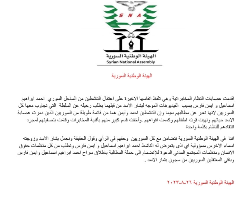 بيان إدانة من الهيئة الوطنية السورية لاعتقال النظام للناشطين أحمد إبراهيم إسماعيل وأيمن فارس من الساحل السوري