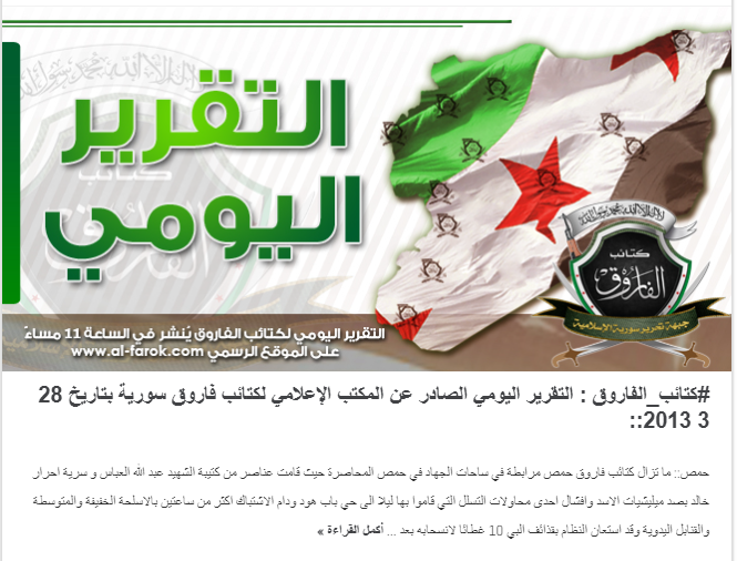 التقرير اليومي الصادر عن المكتب الإعلامي لكتائب فاروق سورية بتاريخ 28 3 2013