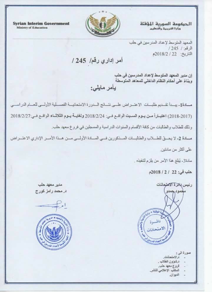 قرار من معهد حلب لإعداد المدرسين بفتح باب تقديم الإعتراضات على نتائج الامتحانات