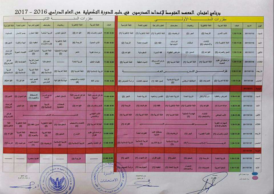إعلان من معهد حلب لإعداد المدرسين حول برنامج امتحان الدورة التكميلية للعام الدراسي 2016-2017