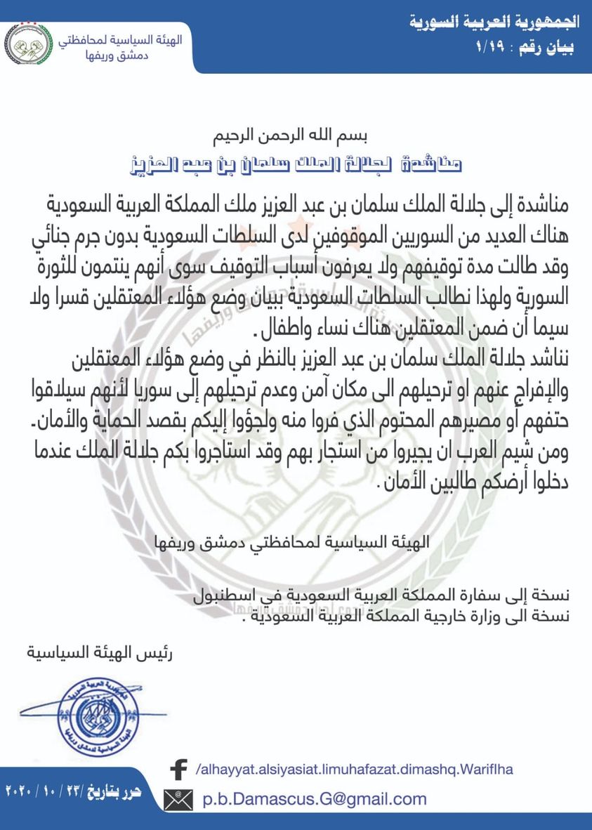 كتاب مناشدة للملك سلمان بن عبد العزيز من الهيئة السياسية لمحافظتي دمشق وريفها بخصوص السجناء السوريين في سجون الترحيلات في جدة والدمام والرياض