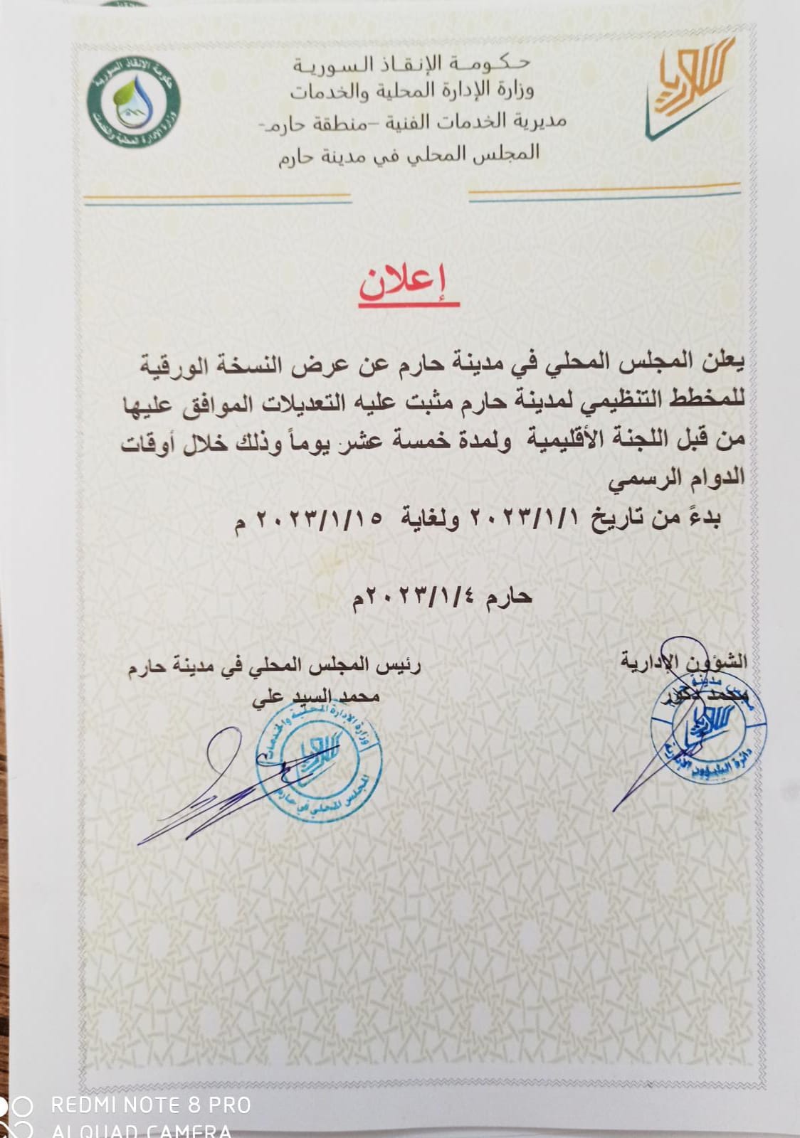إعلان من مجلس مدينة حارم عن النسخة التنظيمية الورقية المعدلة للمدينة