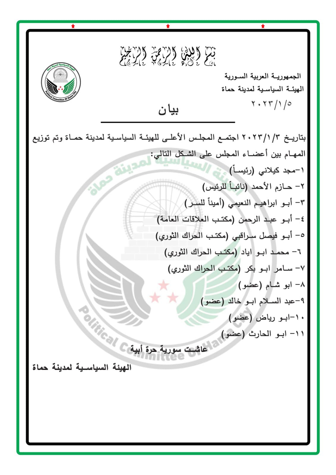 بتاريخ 3/1/2023 اجتمع المجلس الأعلى للهيئة السياسية لمدينة حماة وتم توزيع المهام بين أعضاء المجلس على الشكل التالي