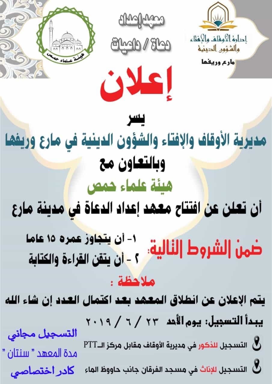 إعلان من مديرية الأوقاف والإفتاء والشؤون الدينية في مارع وريفها عن افتتاح معهد اعداد الدعاة وذلك بالتعاون مع هيئة علماء حمص