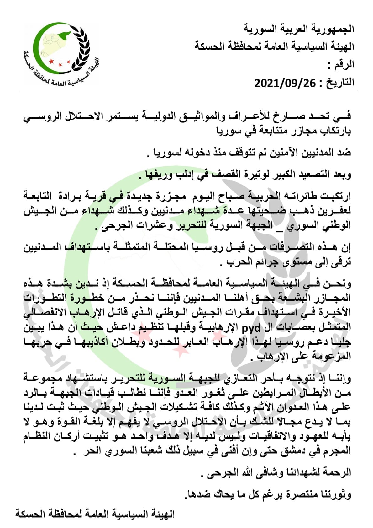 ونحن في الهيئة السياسية العامة لمحافظة الحسكة إذ ندين بشدة هذه المجازر البشعة بحق أهلنا المدنيين فإننا نحذر من خطورة التطورات الأخيرة في استهداف مقرات الجيش الوطني الذي قاتل الإرهاب الانفصالي المتمثل بعصابات ال pyd الإرهابية وقبلها تنظيم داعش حيث أن هذا يبين جليا دعم روسيا لهذا الإرهاب العابر للحدود وبطلان أكاذيبها في حربها المزعومة على الإرهاب .