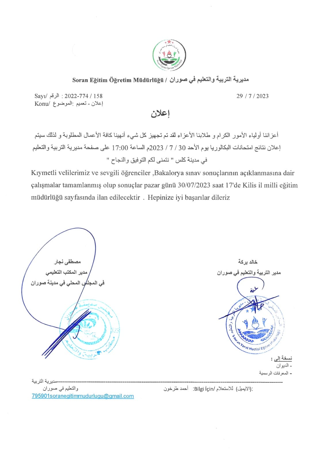 إعلان من مديرية التربية والتعليم في صوران عن تحديد موعد إعلان نتائج امتحانات البكلوريا