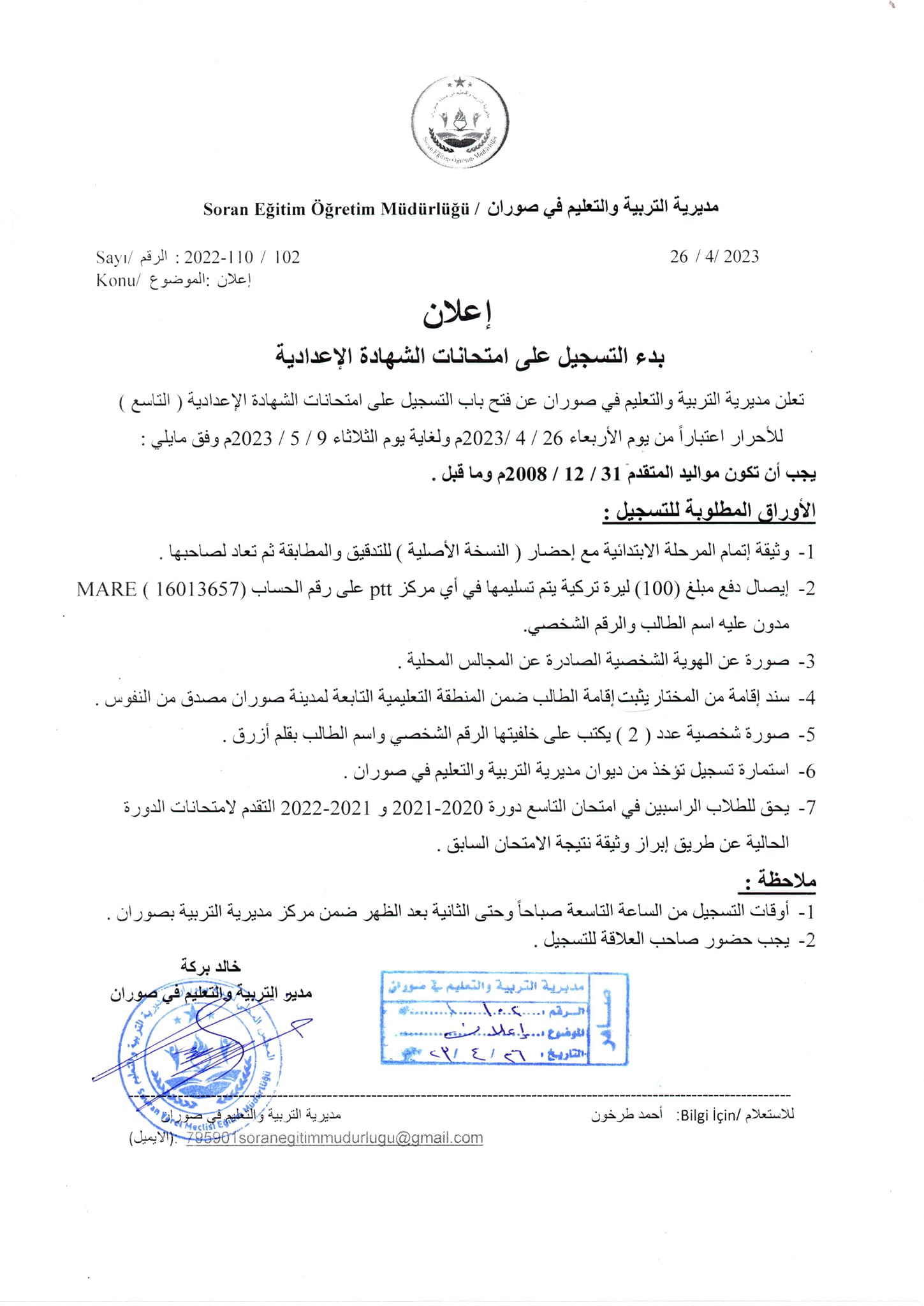تعلن مديرية التربية والتعليم في مدينة صوران عن بدء التسجيل لطلاب شهادة المرحلة الإعدادية النظاميين و الأحرار وفق الشروط المذكورة