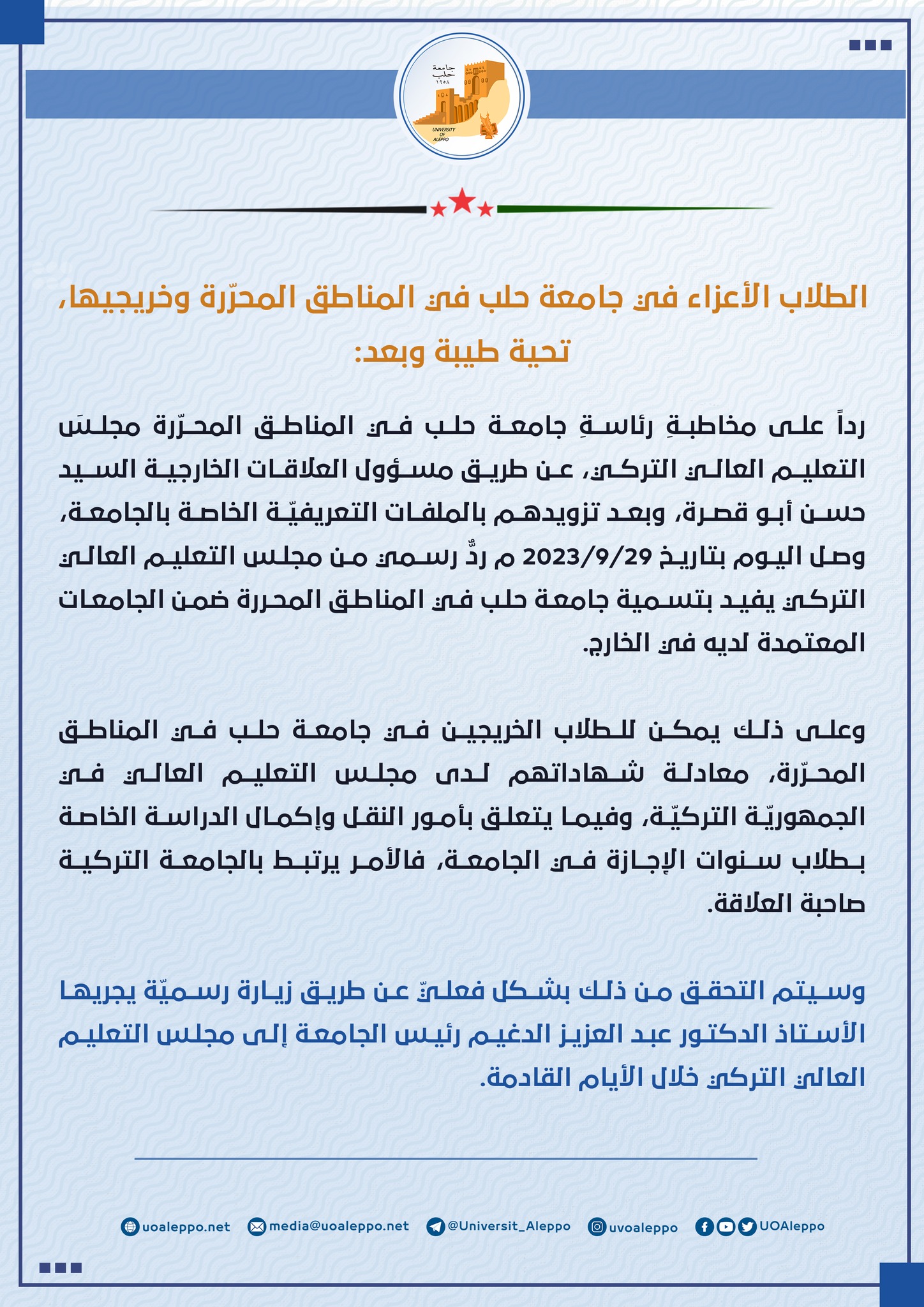 رداً على مخاطبة رئاسة جامعة حلب في المناطق المحررة مجلس التعليم العالي التركي، عن طريق مسؤول العلاقات الخارجية السيد حسن أبو قصرة، وبعد تزويدهم بالملفات التعريفية الخاصة بالجامعة، وصل اليوم بتاريخ 2023/9/29م ردّ رسمى من مجلس التعليم العالي التركي يفيد بتسمية جامعة حلب في المناطق المحررة ضمن الجامعات المعتمدة لديه في الخارج.