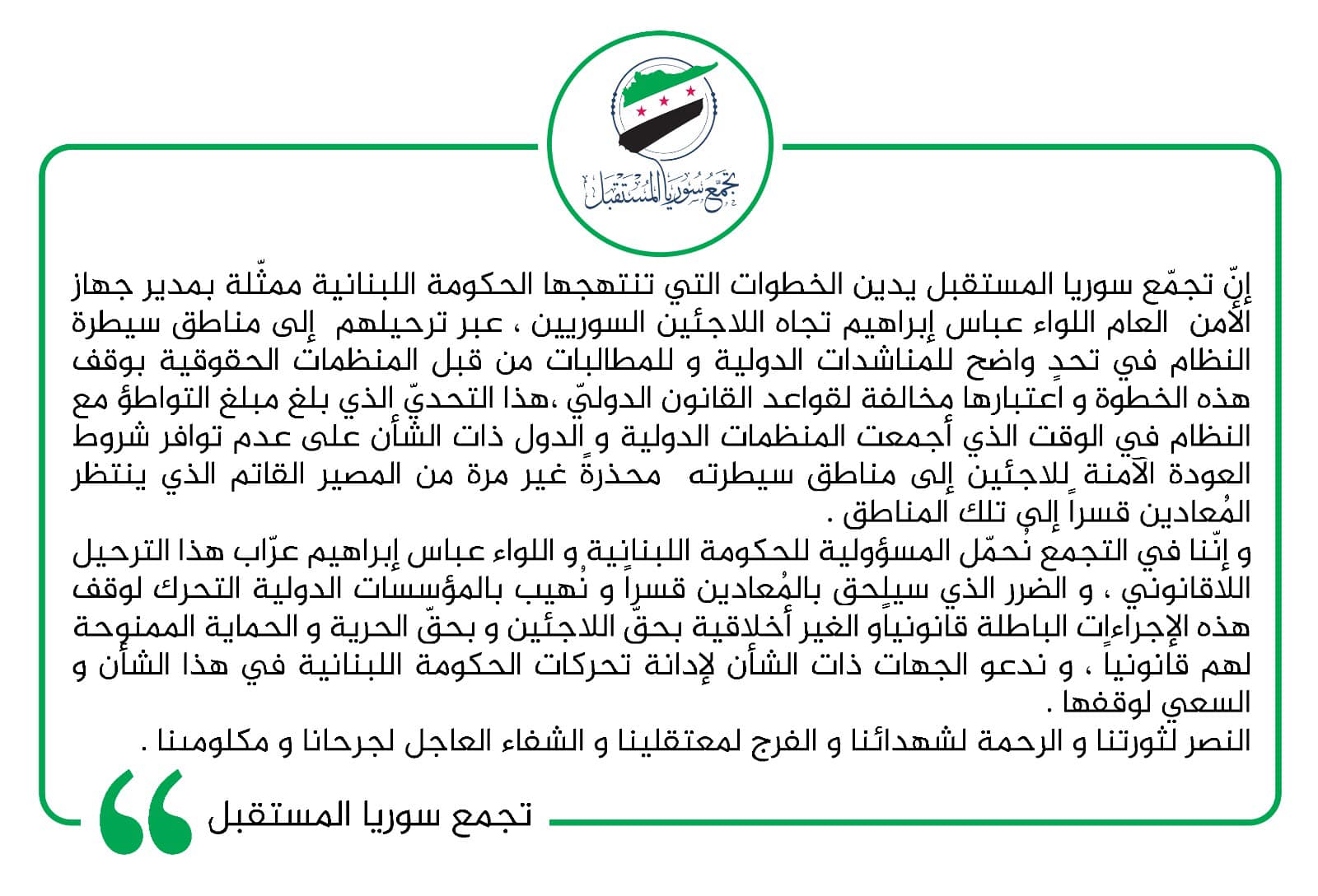 بيان إدانة من تجمع سوريا المستقبل لسياسة الحكومة اللبنانية تجاه اللاجئين وقرار ترحيلهم دون توافر الشروط الآمنة