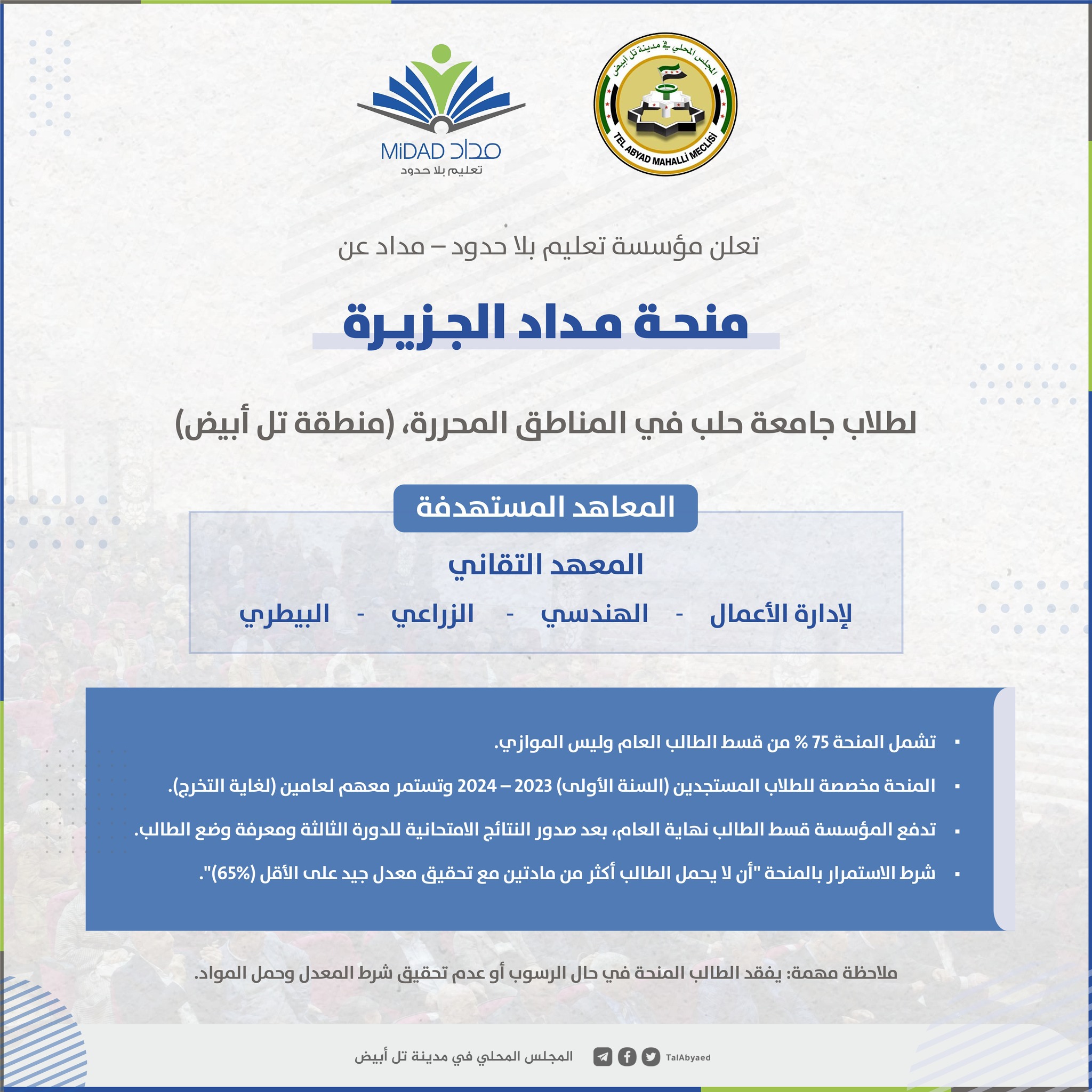 إعلان من المجلس المحلي في مدينة تل أبيض عن فتح مؤسسة تعليم بلا حدود مداد منحة مداد الجزيرة لطلاب جامعة حلب في المناطق المحررة