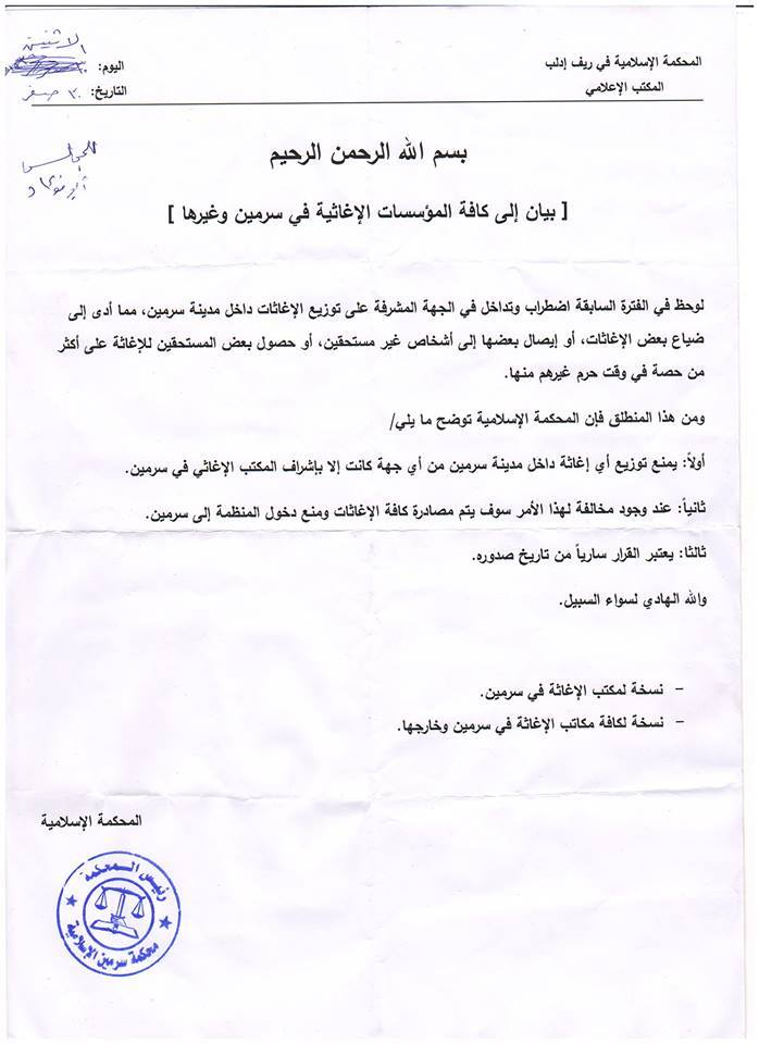 قرار المحكمة الإسلامية في سرمين بحصر توزيع المواد الإغاثية بإشراف المكتب الإغاثي في المدينة