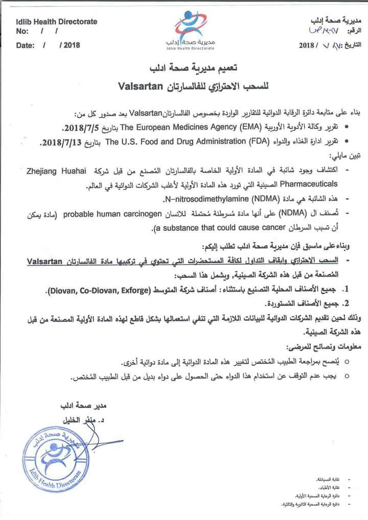 تعميم مديرية صحة إدلب للسحب الاحترازي للفالسارتين