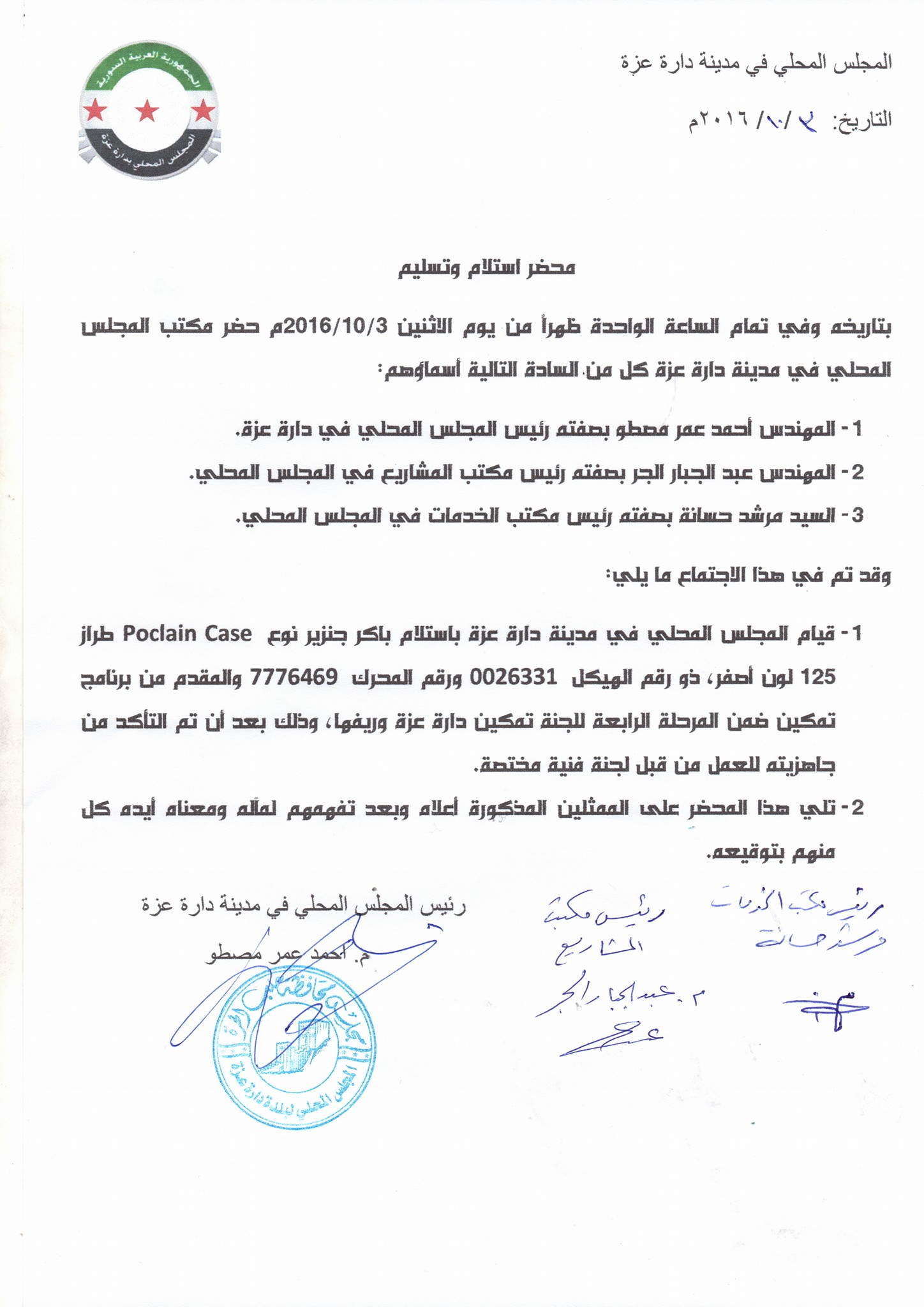محضر استلام وتسليم باكر مجنزر مقدم من برنامج تمكين للمجلس المحلي لمدينة دارة عزة
