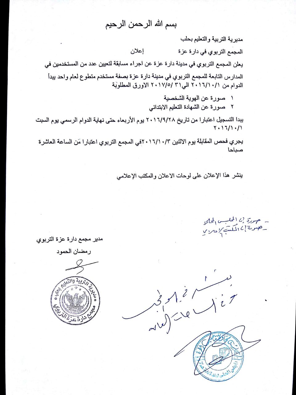 إعلان من المجمع التربوي في مدينة دارة عزة حول إجراء مسابقة لتعيين عدد من المستخدمين في المدارس التابعة للمجمع التربوي في المدينة
