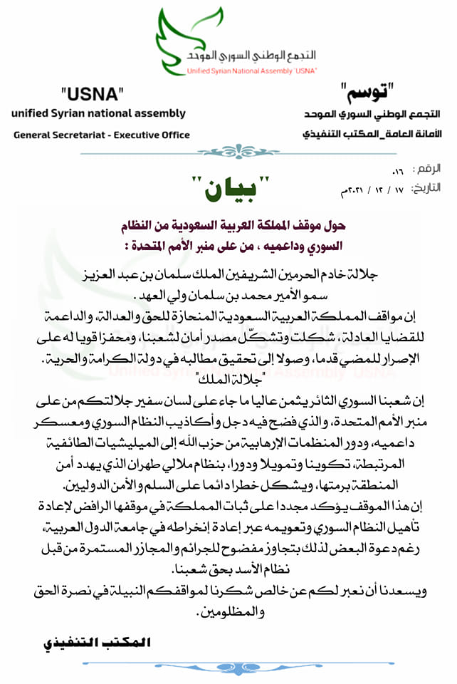 بيان التجمع الوطني السوري الموحد حول موقف المملكة العربية السعودية من النظام السوري وداعميه