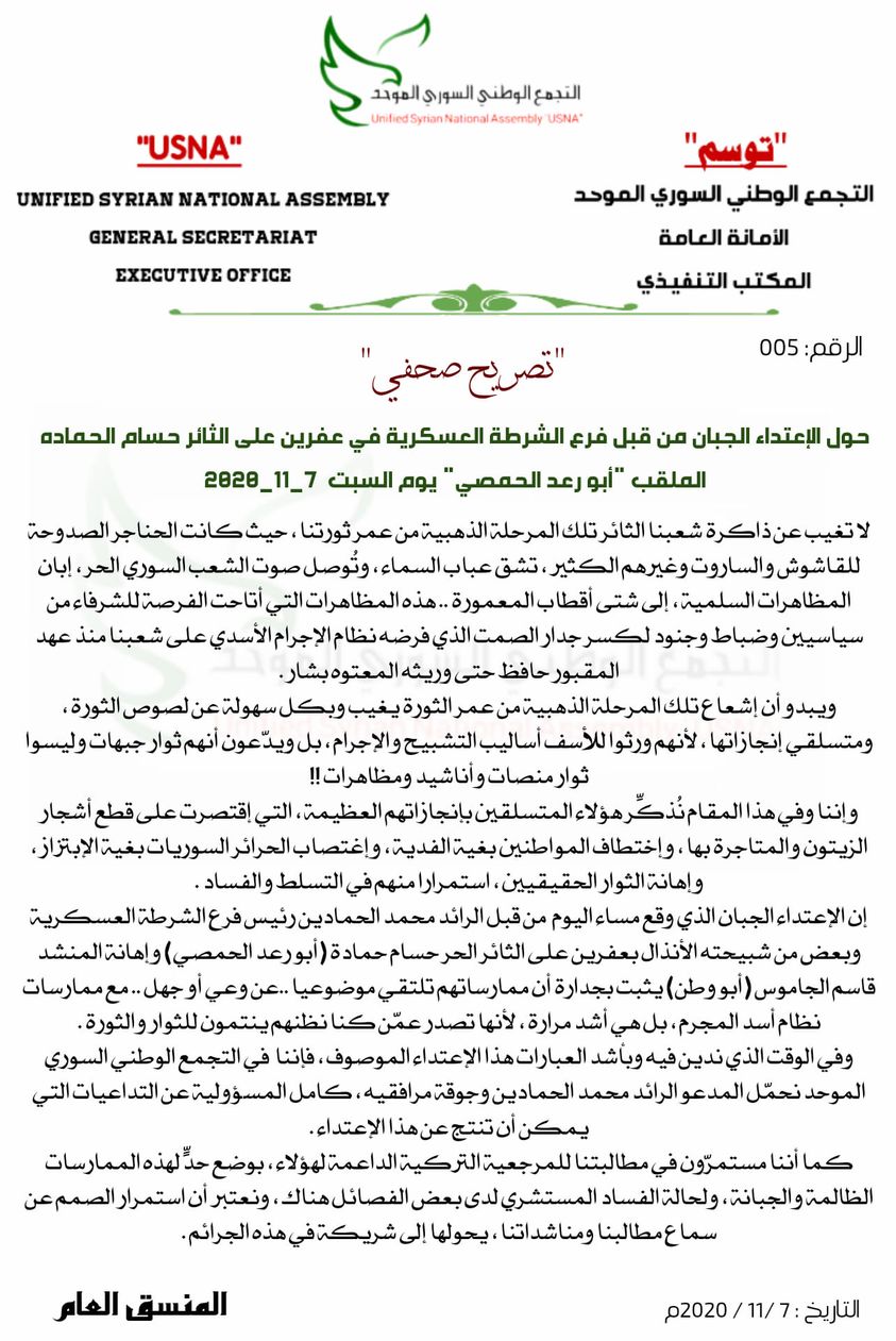 تصريح صحفي للمنسق العام لتجمع "توسم" حول الإعتداء على الثائر "حسام الحمادة" الملقب "أبورعد الحمصي" من قبل عناصر فرع الشرطة العسكرية في عفرين