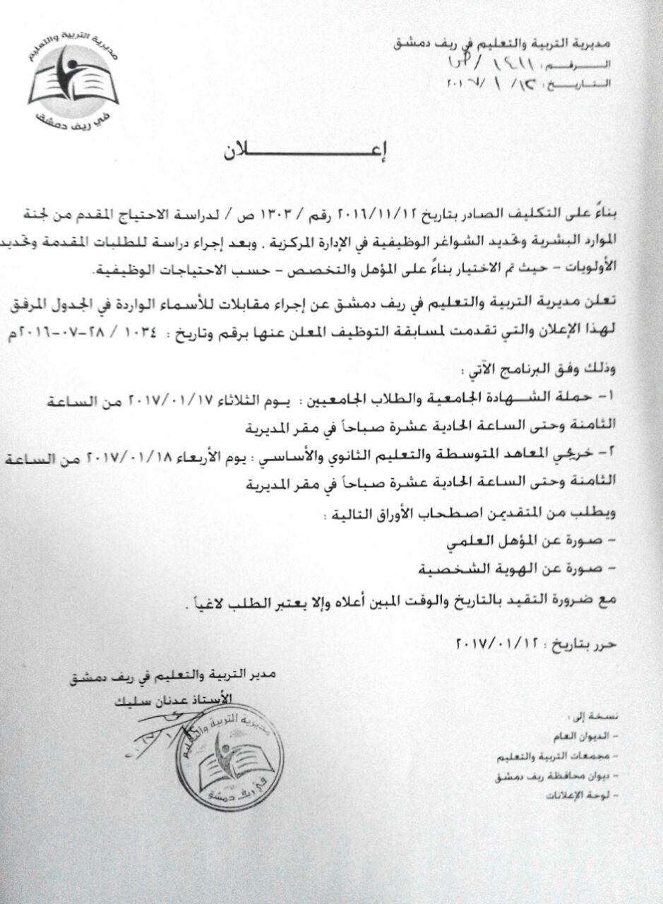 إعلان من مديرية التربية والتعليم في ريف دمشق بشأن مقابلات مسابقات التوظيف