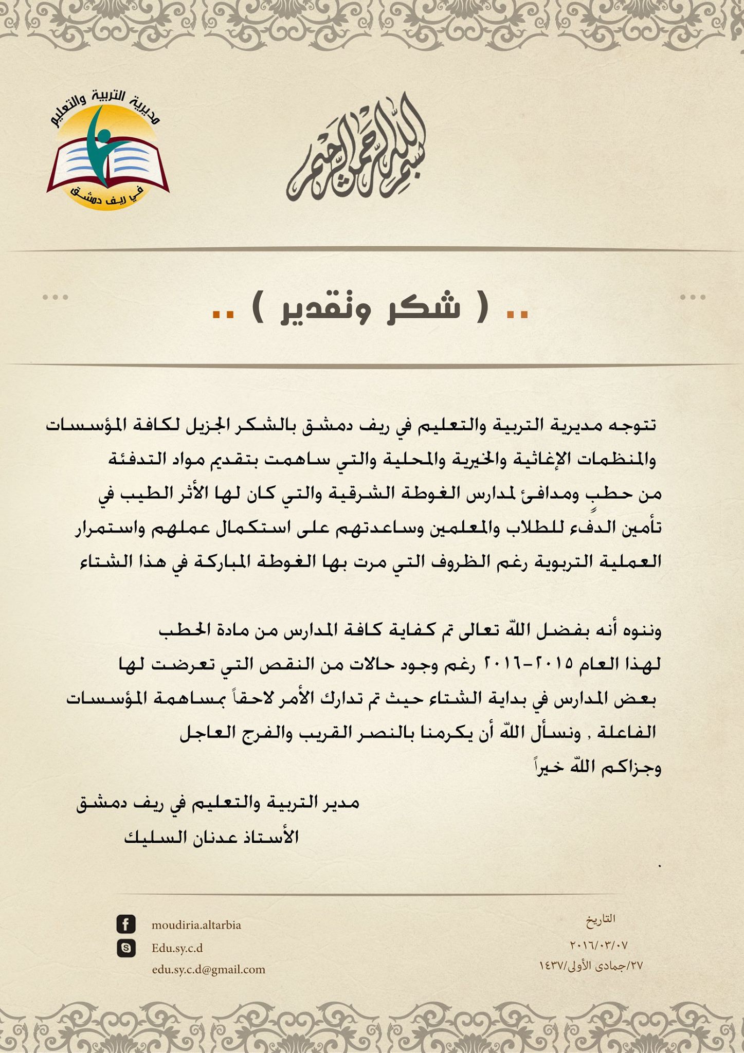 بيان شكر من مديرية التربية والتعليم في ريف دمشق لجميع المؤسسات والجمعيات التي ساهمت بتقديم مواد التدفئة لمدارس الغوطة الشرقية
