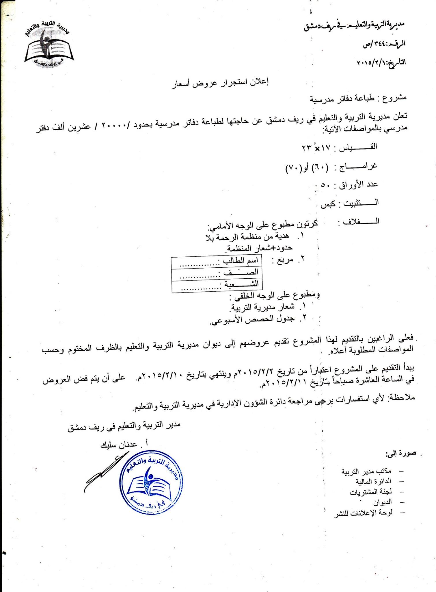 إعلان من مديرية التربية والتعليم في ريف دمشق حول حاجتها لعروض أسعار لطباعة دفاتر مدرسية لطباعة 20 ألف دفتر