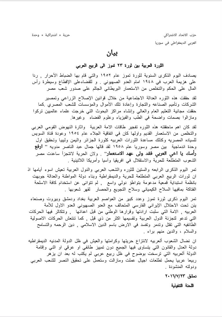 بيان حزب الاتحاد الاشتراكي في ذكرى ثورة 23 تموز