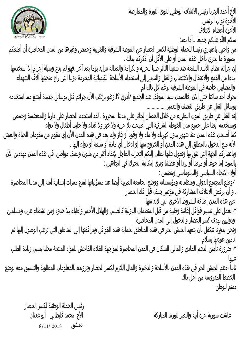 بيان من الحملة الوطنية لكسر الحصار عن المدن المحاصرة
