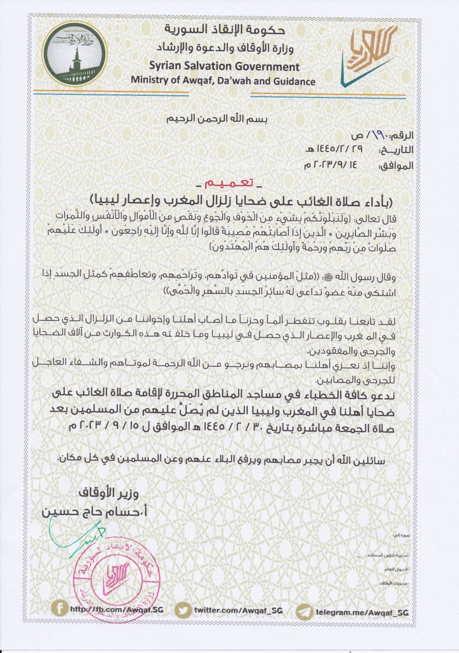 **تعميم يدعو كافة الخطباء في مساجد المناطق المحررة لإقامة صلاة الغائب على ضحايا أهلنا في المغرب وليبيا** ========================================================================================================