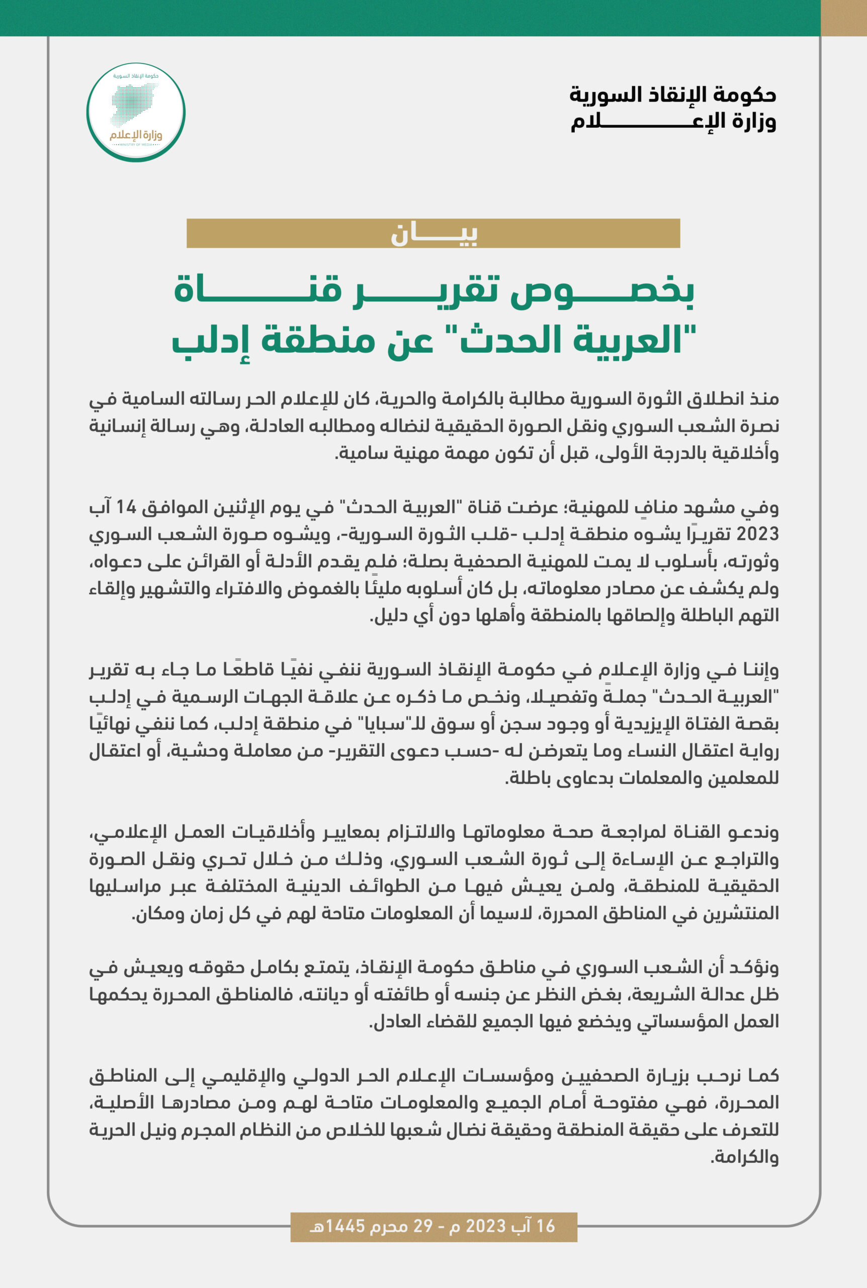 بيان من وزارة الإعلام بخصوص تقرير قناة “العربية الحدث” عن منطقة إدلب