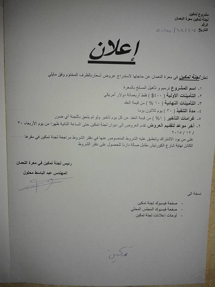 إعلان من لجنة تمكين معرة النعمان حول رغبتها استدراج عروض أسعار لترميم المسلخ