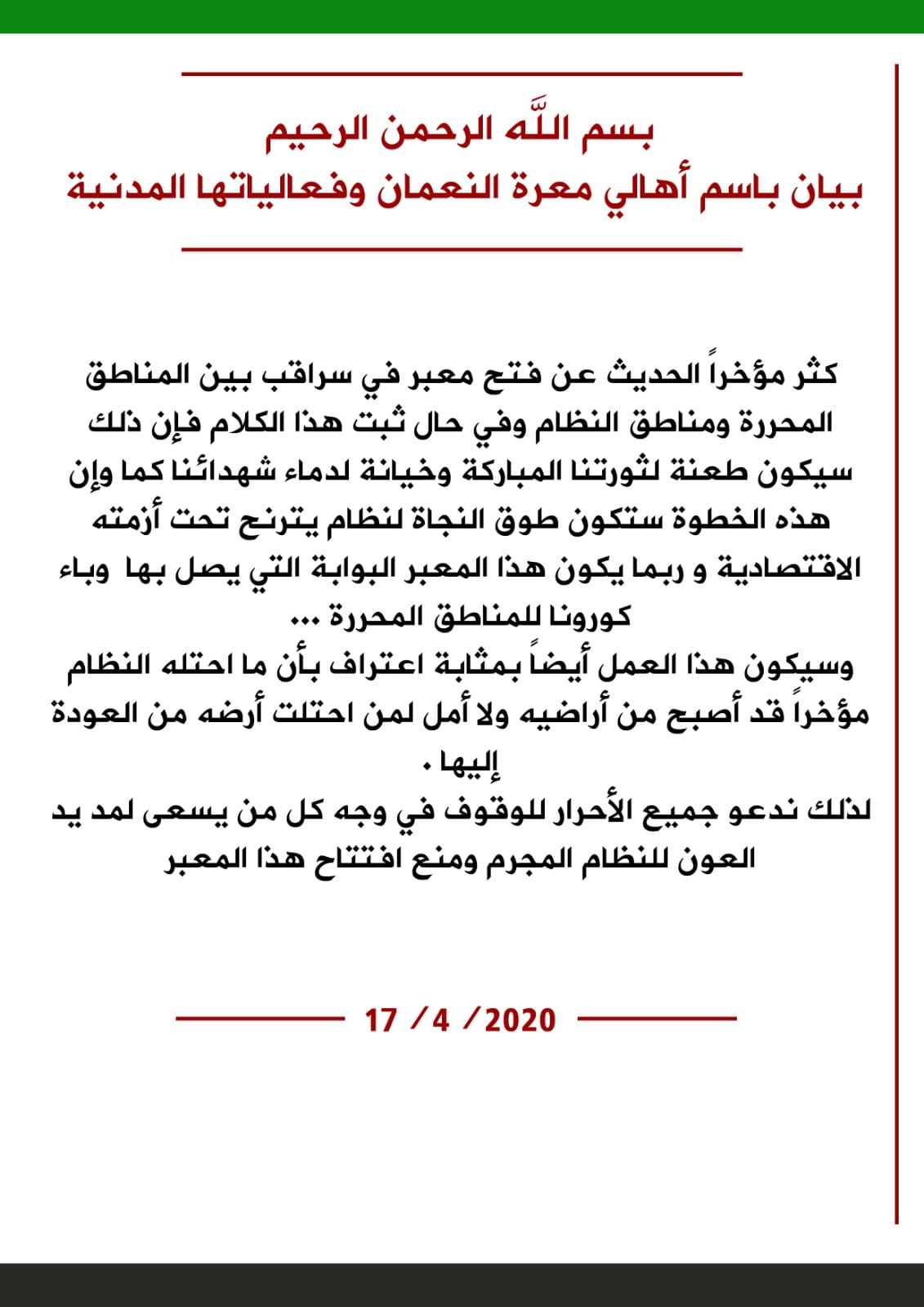 بيان من مجلس شورى معرة النعمان وأهالي المدينة وفعالياتها المدنية بخصوص الكلام عن فتح معبر سراقب