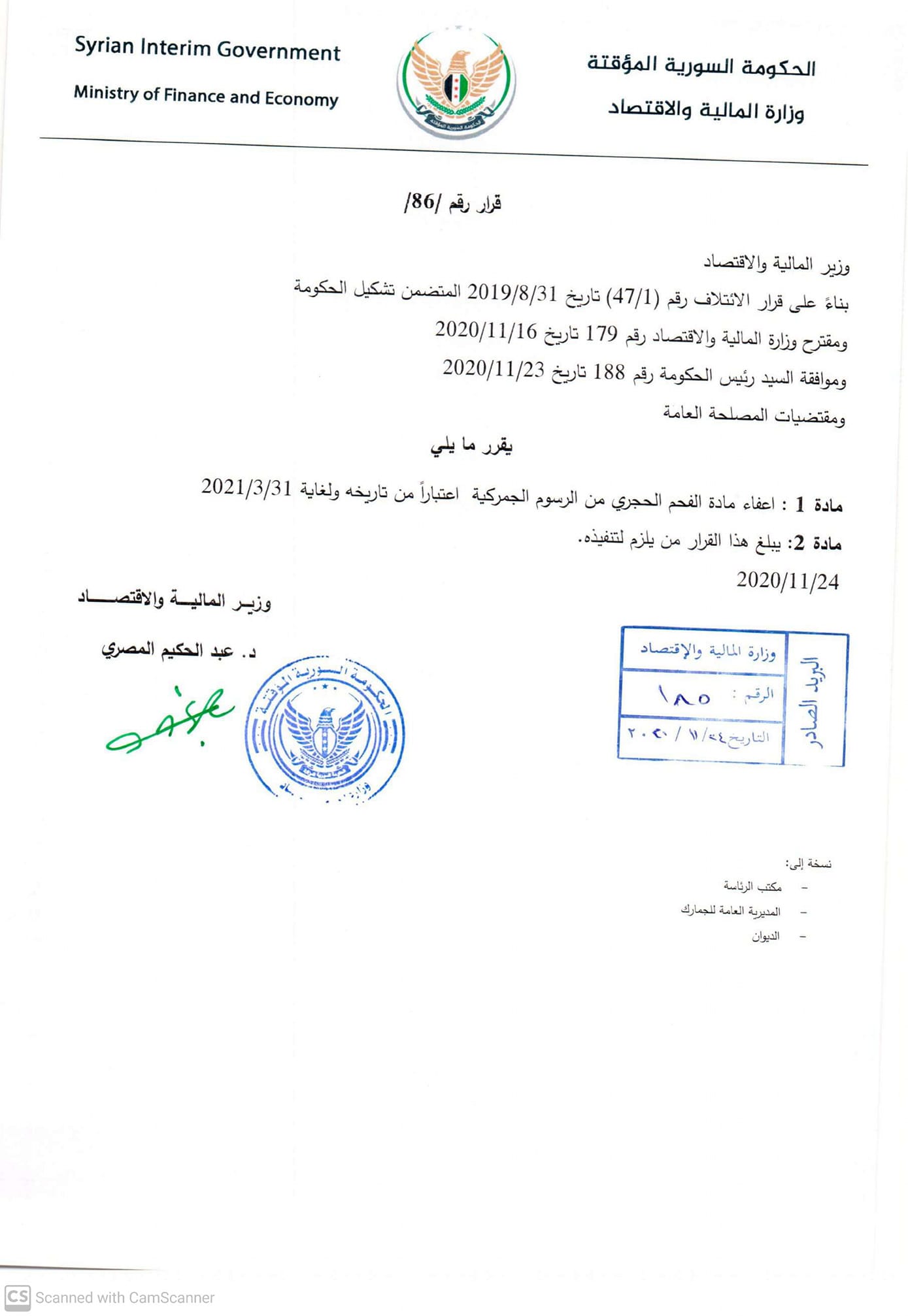 قرار من وزارة المالية والاقتصاد في الحكومة المؤقتة بإعفاء مادة الفحم الحجري من الرسوم الجمركية
