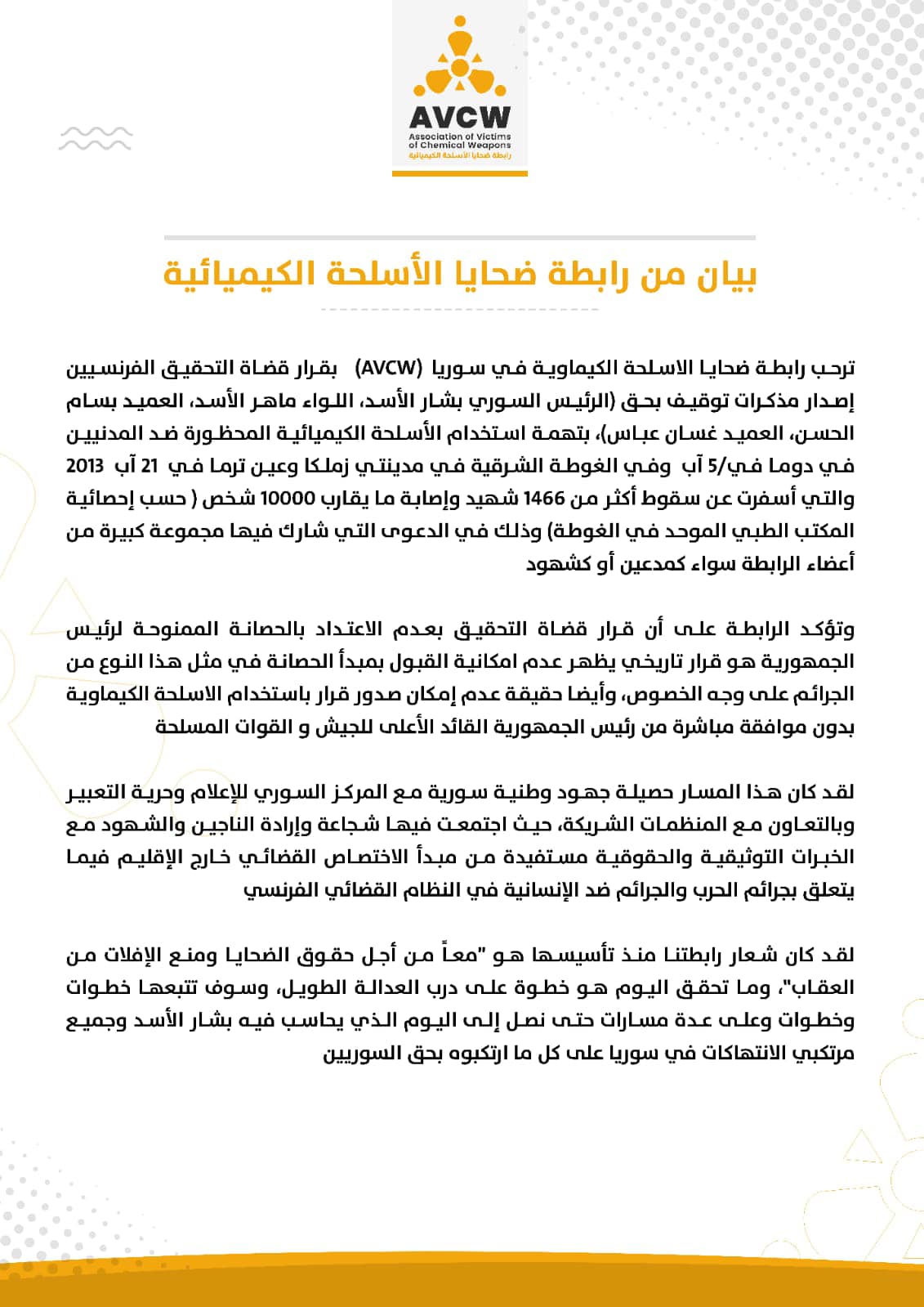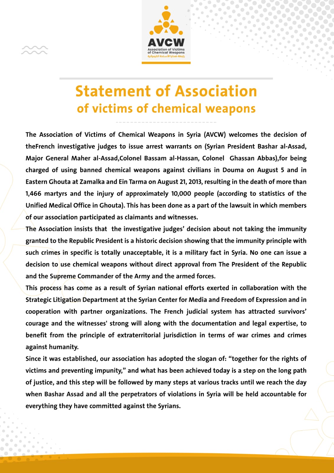ترحب رابطة ضحايا الأسلحة الكيماوية في سوريا ( AVCW) بقرار قضاة التحقيق الفرنسيين إصدار مذكرات توقيف بحق (الرئيس السوري بشار الأسد، اللواء ماهر الأسد، العميد بسام الحسن، العميد غسان عباس)، بتهمة استخدام الأسلحة الكيميائية المحظورة ضد المدنيين في دوما في/5 آب وفي الغوطة الشرقية في منطقتي زملكا وعين ترما في 21 آب 2013 والتي أسفرت عن سقوط أكثر من 1466 شهيد وإصابة ما يقارب 10000 شخص ( حسب إحصائية المكتب الطبي الموحد في الغوطة) وذلك في الدعوى التي شارك فيها مجموعة كبيرة من أعضاء الرابطة سواء كمدعين اوكشهود.