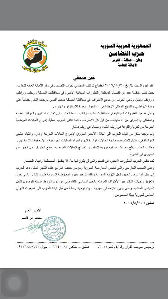بيان صحفي عقب اجتماع المكتب السياسي لحزب التضامن حول قضايا داخلية وتطور الأوضاع في سورية