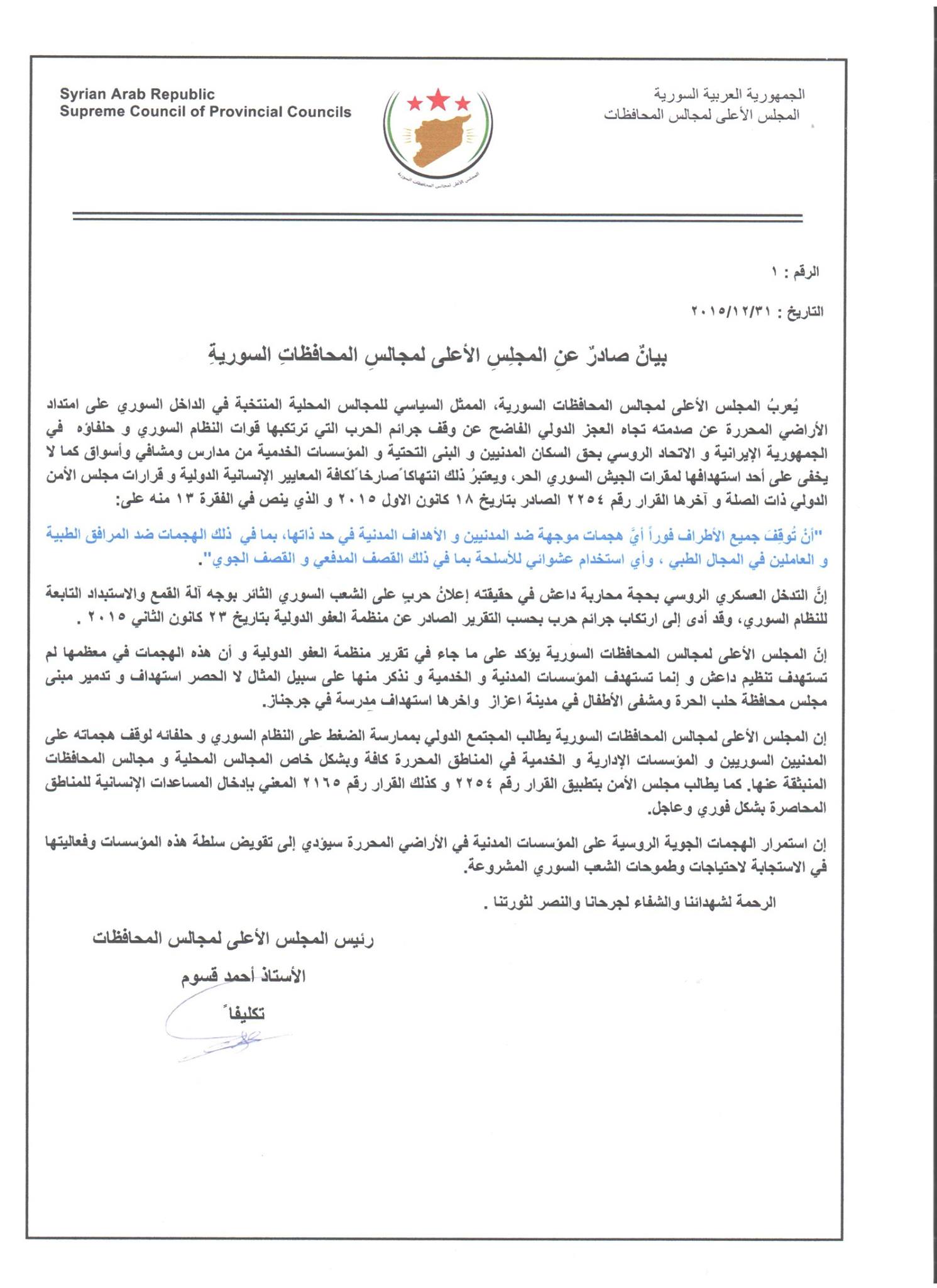 يُعربُ المجلس الأعلى لمجالس المحافظات السورية، الممثل السياسي للمجالس المحلية المنتخبة في الداخل السوري على امتداد الأراضي المحررة عن صدمته تجاه العجز الدولي الفاضح عن وقف جرائم الحرب التي ترتكبها قوات النظام السوري و حلفاؤه في الجمهورية الإيرانية و الاتحاد الروسي بحق السكان المدنيين و البنى التحتية و المؤسسات الخدمية من مدارس ومشافي وأسواق كما لا يخفى على أحد استهدافها لمقرات الجيش السوري الحر, ويعتبرُ ذلك انتهاكا ًصارخا ًلكافة المعايير الإنسانية الدولية و قرارات مجلس الأمن الدولي ذات الصلة و آخرها القرار رقم 2254 الصادر بتاريخ 18 كانون الاول 2015 و الذي ينص في الفقرة 13 منه على: