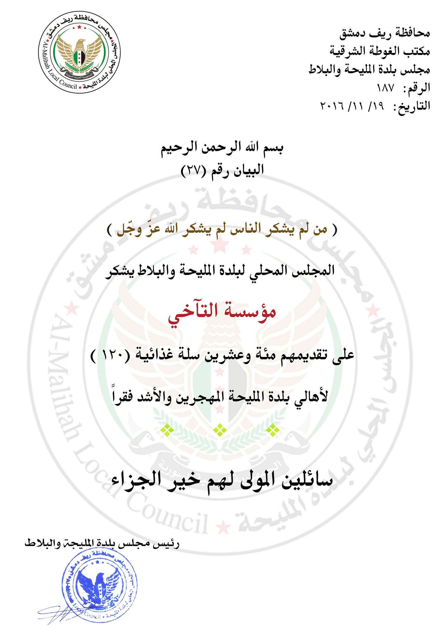 بيان شكر من المجلس المحلي لبلدة المليحة لمؤسسة التآخي على تقديمهم 120 سلة غذائية لأهالي البلدة