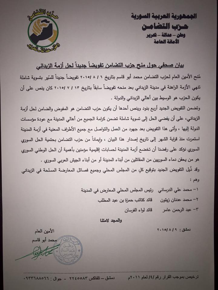 بيان من حزب التضامن للرد على المشككين في تفويض الحزب من فصائل الزبداني لحل المشكلة