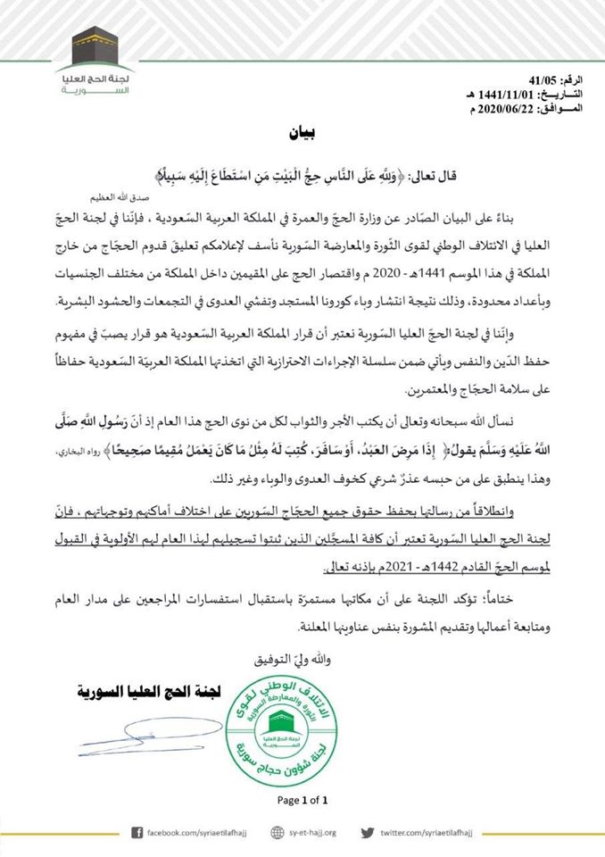 بناءً على البيان الصّادر عن وزارة الحجّ والعمرة في المملكة العربية السّعودية ، فإنّنا في لجنة الحجّ العليا في الائتلاف الوطني لقوى الثّورة والمعارضة السّورية نأسف لإعلامكم تعليقَ قدوم الحجّاج من خارج المملكة في هذا الموسم 1441هـ - 2020 م واقتصار الحج على المقيمين داخل المملكة من مختلف الجنسيات وبأعداد محدودة، وذلك نتيجة انتشار وباء كورونا المستجد وتفشي العدوى في التجمعات والحشود البشرية.