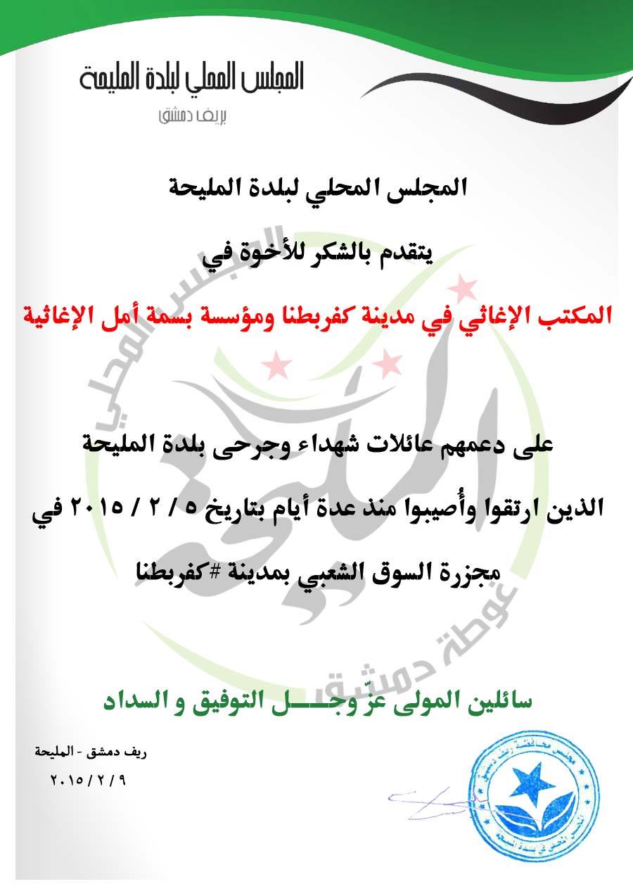 بيان شكر من المجلس المحلي لبلدة المليحة لمنظمة بسمة أمل والمكتب الإغاثي في مدينة كفر بطنا على دعمهم عائلات شهداء وجرحى المدينة
