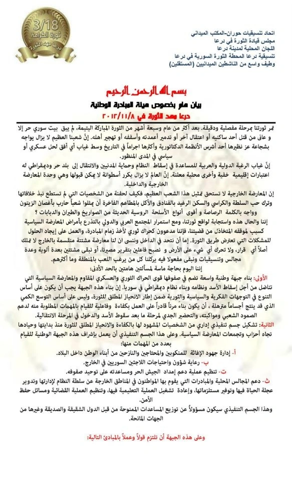 بيان هام بخصوص هيئة المبادرة الوطنية درعا مهد الثورة في 8/11/2012