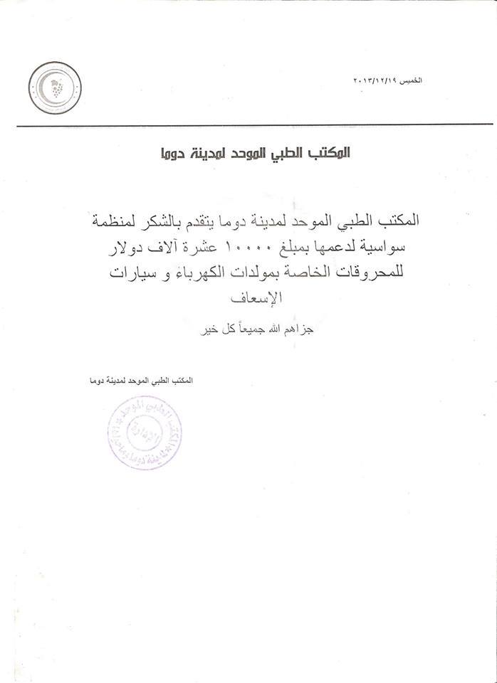 بيان شكر من المكتب الطبي لمدينة دوما لمنظمة سواسية على تقديمها مبلغ عشرة آلاف دولار ثمن محروقات للمولدات وسيارات الإسعاف