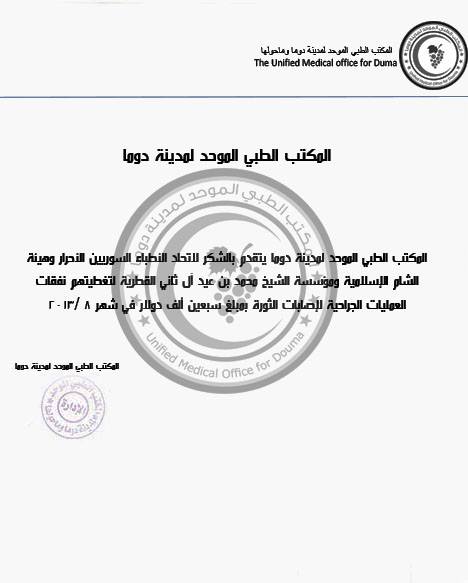 لمكتب الطبي الموحد لمدينة دوما يتقدم بالشكر لاتحاد الاطباء السوريين الاحرار وهيئة الشام الإسلامية ومؤسسة الشيخ محمد بن عيد آل ثاني القطرية لتغطيتهم نفقات العمليات الجراحية ﻹصابات الثورة بمبلغ سبعين ألف دولار في شهر 8 /2013