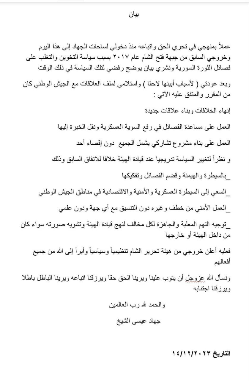 بيان جهاد عيسى الشيخ (أحمد زكور) لإعلان خروجه من صفوف هيئة تحرير الشام