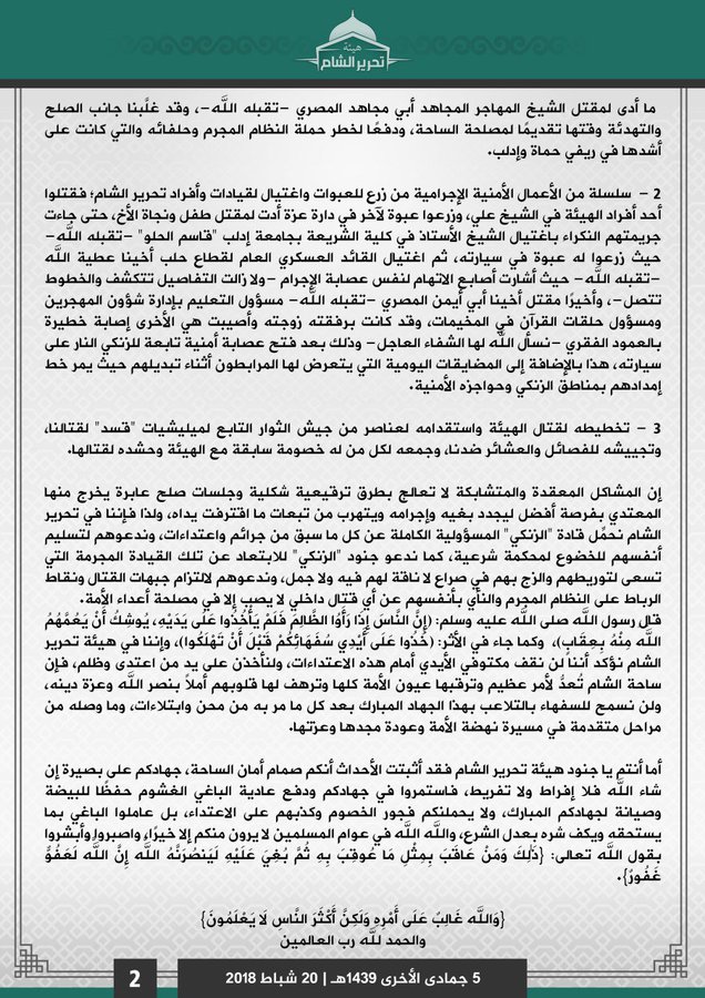 إن المشاكل المعقدة والمتشابكة لا تعالج بطرق ترقيعية شكلية وجلسات صلح عابرة يخرج منها المعتدي بفرصة أفضل ليجدد بغيه وإجرامه ويتهرب من تبعات ما اقترفت يداه، ولذا فإننا في تحرير الشام نحمّل قادة "الزنكي" المسؤولية الكاملة عن كل ما سبق من جرائم واعتداءات، وندعوهم لتسليم أنفسهم للخضوع لمحكمة شرعية، كما ندعو جنود "الزنكي" للابتعاد عن تلك القيادة المجرمة التي تسعى لتوريطهم والزج بهم في صراع لا ناقة لهم فيه ولا جمل، وندعوهم لالتزام جبهات القتال ونقاط الرباط على النظام المجرم والنأي بأنفسهم عن أي قتال داخلي لا يصب إلا في مصلحة أعداء الأمة.