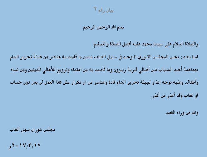 اما بعد: نحـن المجلس الثوري المـوحـد في سـهـل الغـاب نـدين ما قامت به عناصر من هيئة تحرير الشام