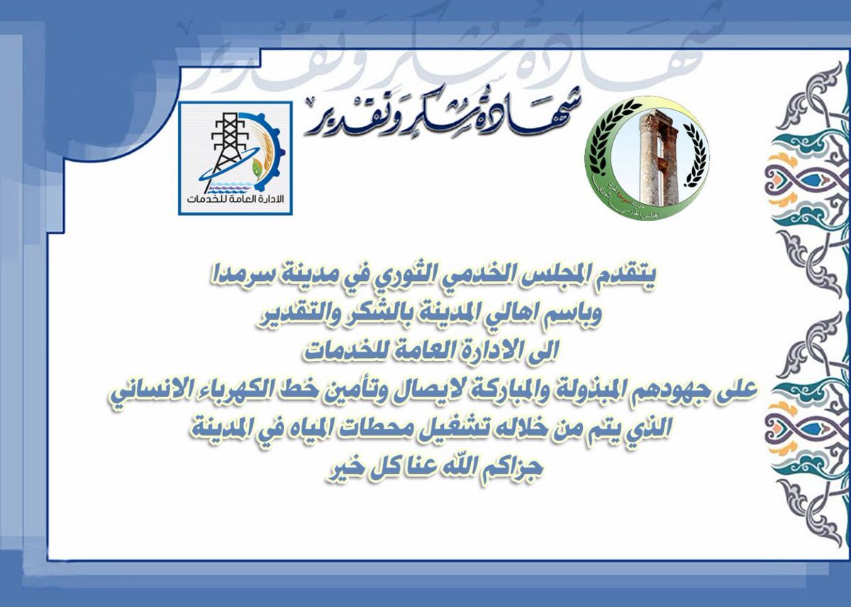 بيان من المجلس الخدمي الثوري في مدينة سرمدا يشكر فيه الإدارة العامة للخدمات على جهودها المبذولة والمباركة لايصال وتأمين خط الكهرباء الانساني