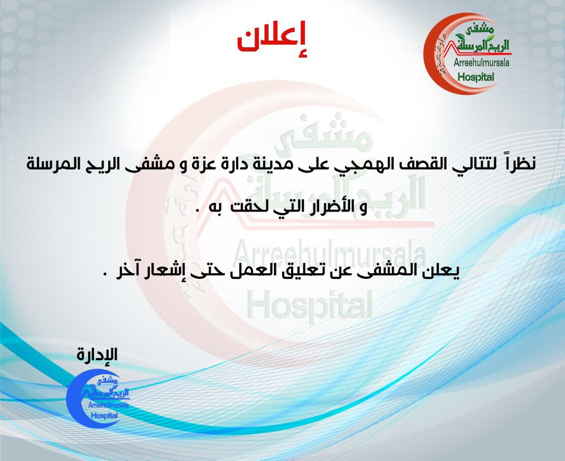 نظرا لتتالي القصف الهمجي على مدينة دارة عزة ومشفى الريح المرسلة والأضرار التي لحقت به .
