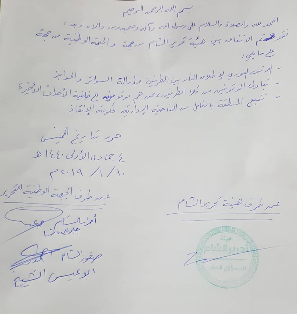اتفاق صقور الشام مع هيئة تحرير الشام لتسليم مناطق لسلطة حكومة الإنقاذ