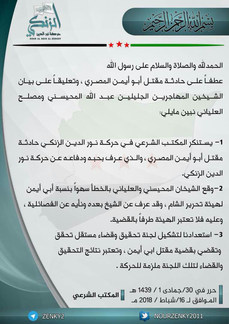 بيان حركة نور الدين الزنكي بخصوص مقتل أبو أيمن المصري